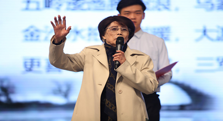 高齡的葛蘭教授親臨現(xiàn)場,帶領(lǐng)大家齊頌經(jīng)典紅色詩篇——《七律˙長征》,點燃了整個會場。